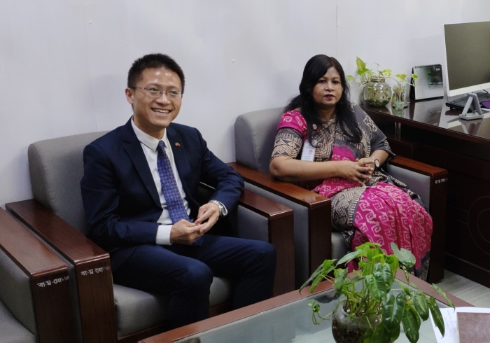 2026年4月8日,宋扬参赞会见孟加拉国商务部世贸组织司司长纳兹尼恩,就两国加强多边合作有关事宜深入交换意见。白诏晞三秘参加。